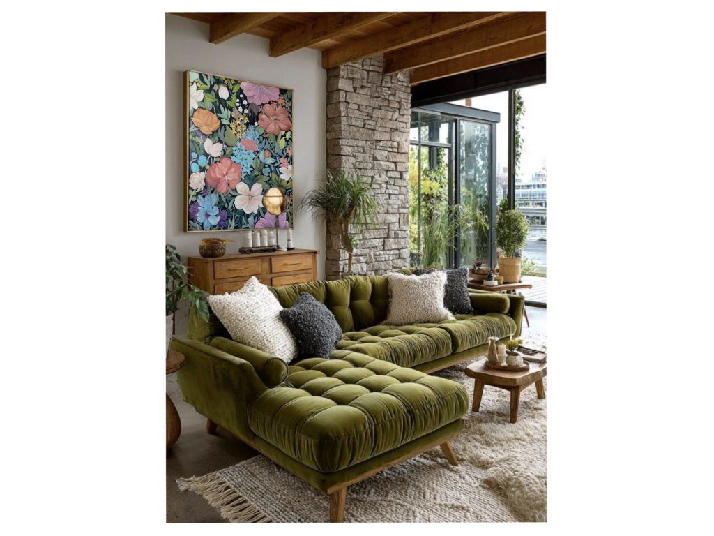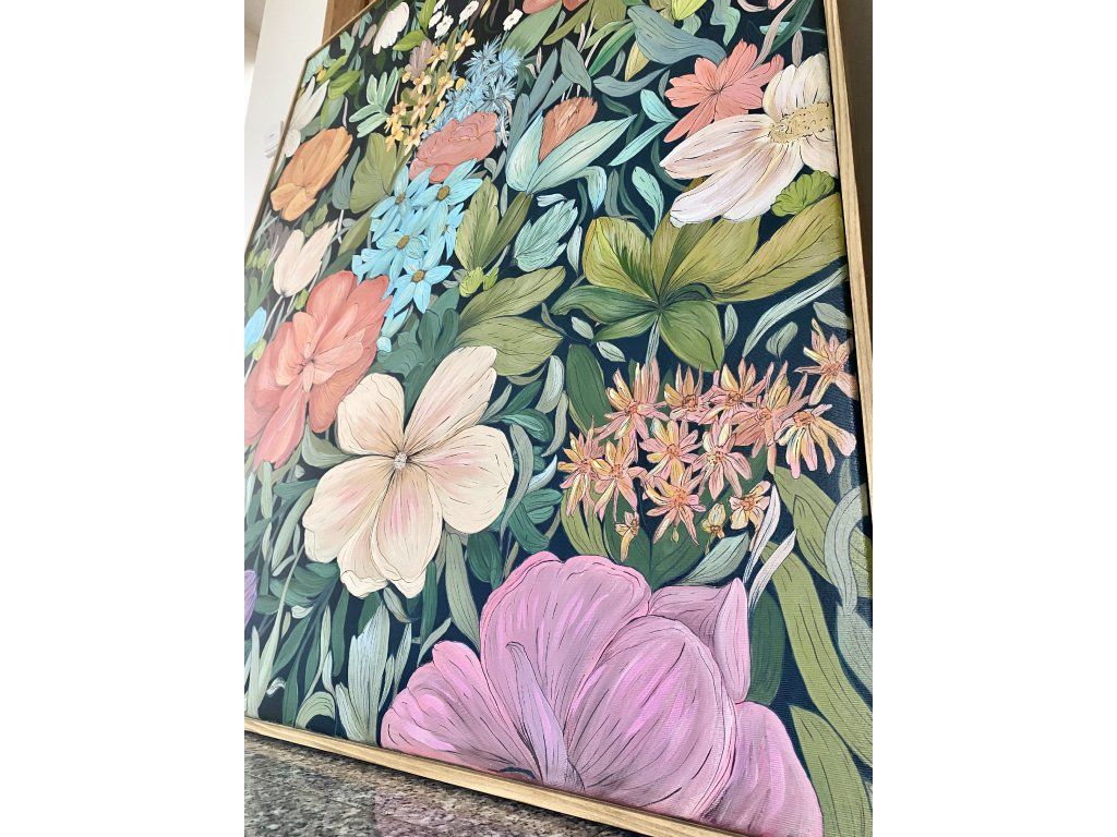Obraz je oslavou rozmanitosti a krásy přírody. Kompozice plná květin v teplých oranžových, jemně růžových, modrých a zelených tónech vytváří harmonický a živý celek. Jemné tahy štětcem a vrstvení barev dodávají hloubku a plastický efekt, čímž se jednotlivé květy a listy zdají téměř trojrozměrné.