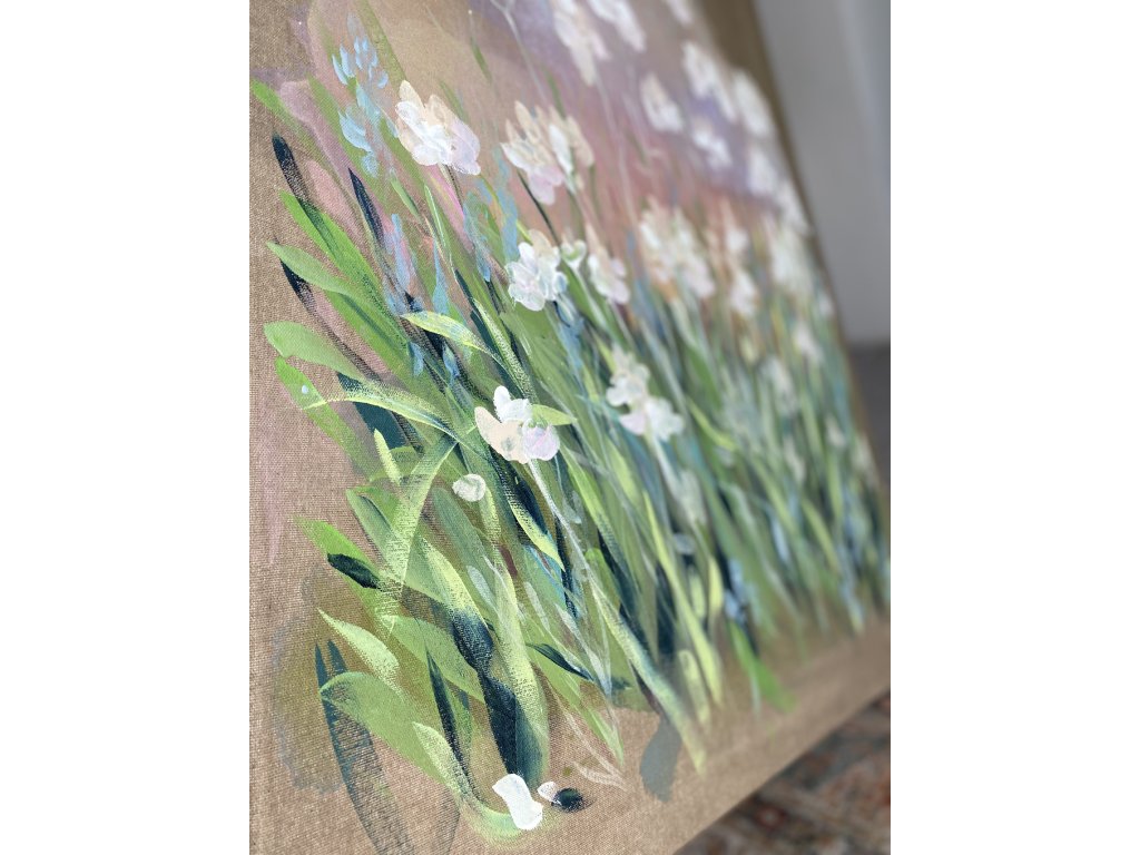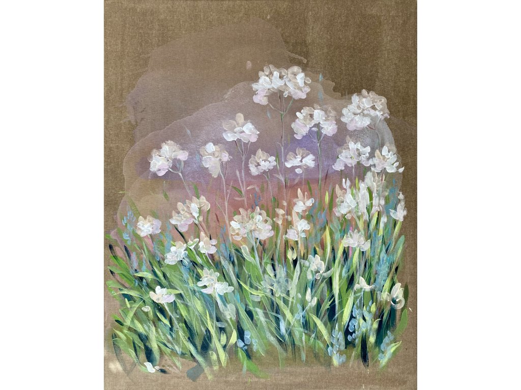 Akryl na prírodnom plátne (80 × 100 cm), ktorý dýcha ľahkosťou a prináša do priestoru jemnosť a ľahkosť lúčnych kvetov.