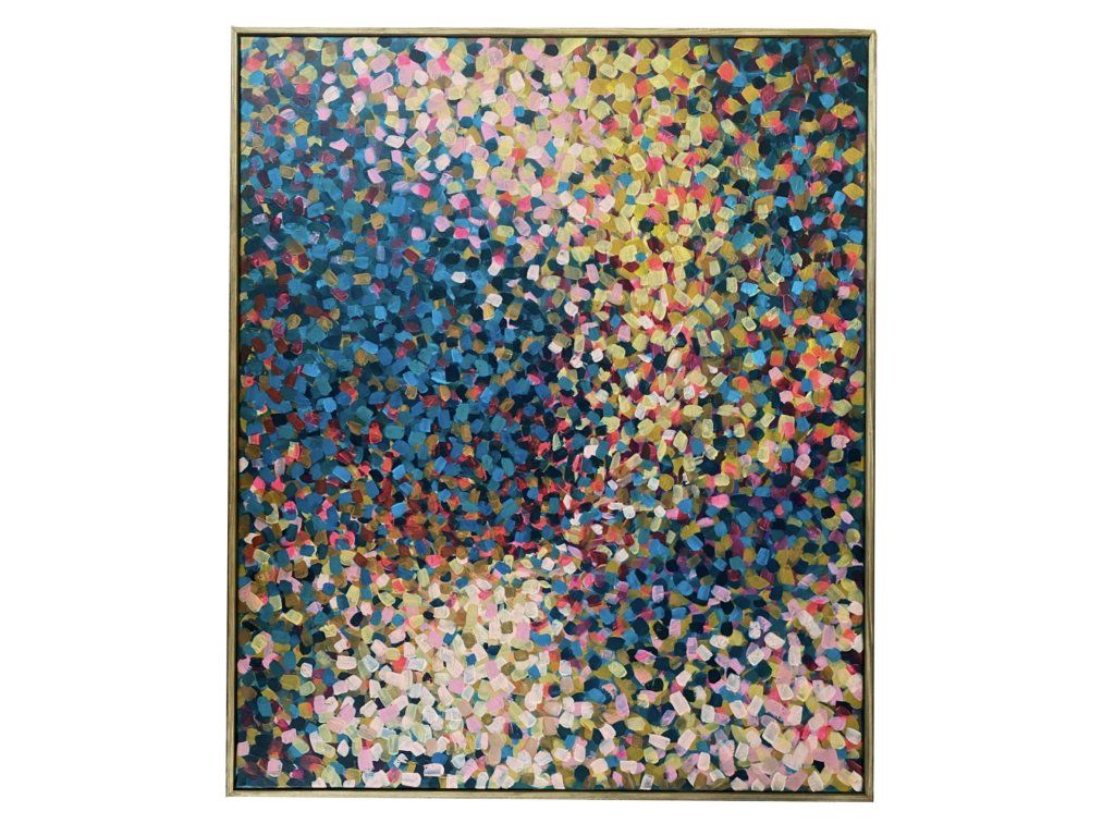Obraz Prisma zachycuje energii barev rozptýlených v pohybu. Jemné vrstvy tyrkysové, zlaté, růžové a krémové barvy vytvářejí pulzující kompozici, která připomíná světlo lámající se přes hranol. Z dálky působí jako živý proud světla, zblízka odhaluje množství drobných gest a detailů.